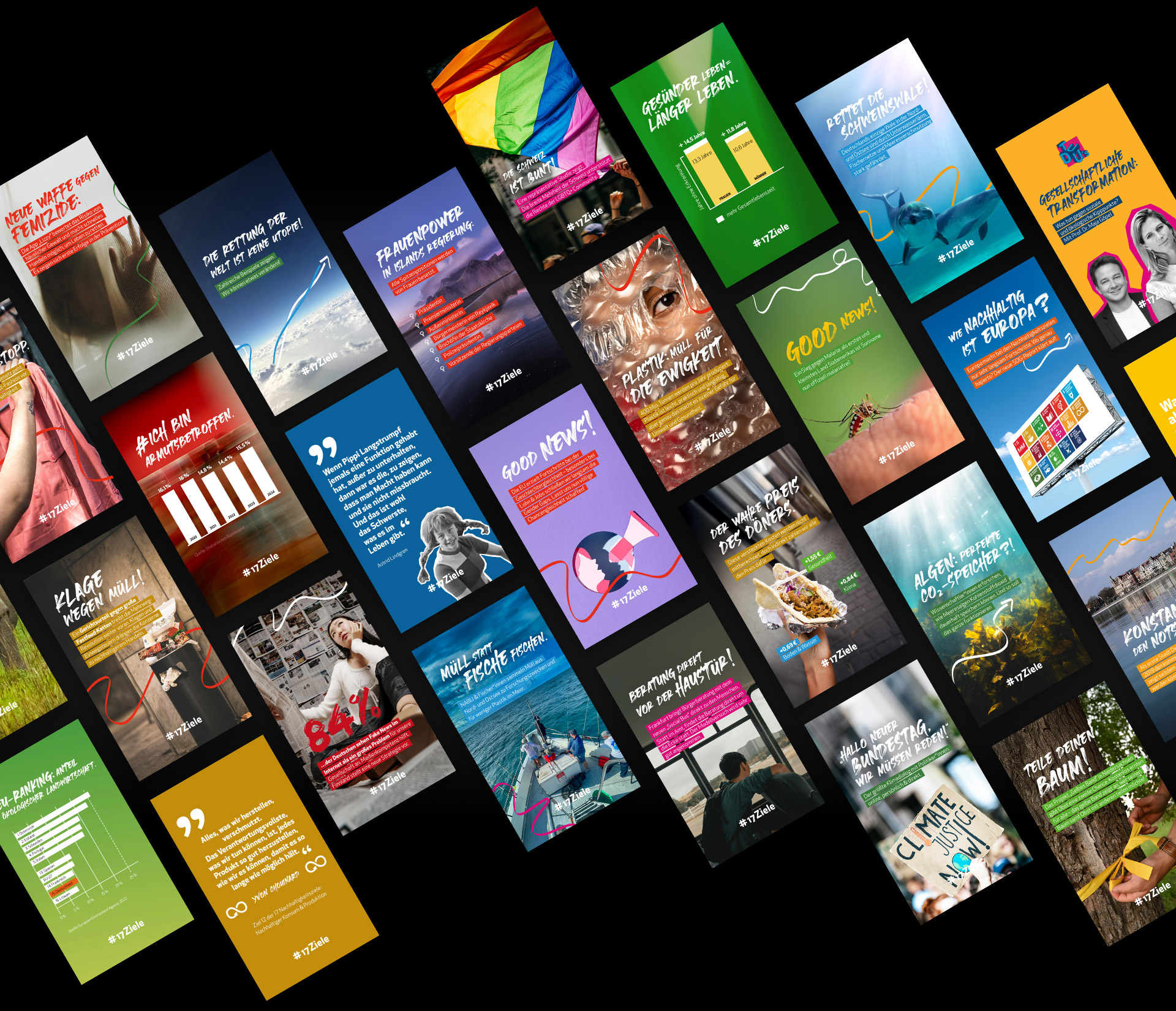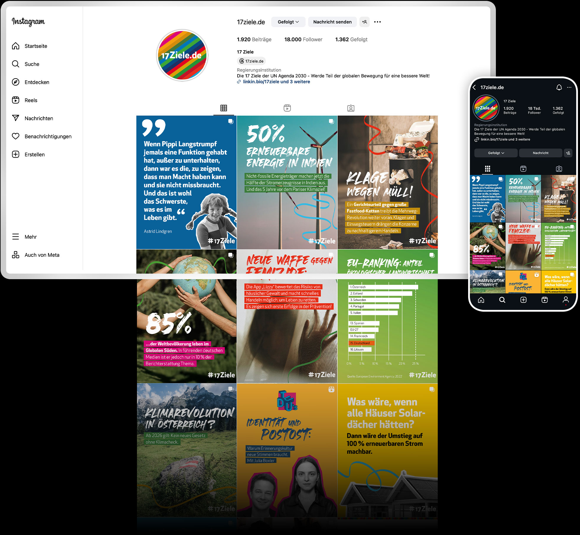 Auf den Social Media Kanälen von #17Ziele schaffen wir ein Bewusstsein für die Probleme der Welt, indem wir zeigen, welche Lösungen es dafür gibt, die Ziele der Agenda 2030 nachhaltig zu erreichen. Und wir vermitteln Ideen, was jeder und jede Einzelne dafür tun kann: Die TU DU’s am Ende jedes Postings sind ein jeweils passender Aufruf, sich mit den Themen auseinanderzusetzen und zu engagieren. Bei der Gestaltung spiegeln die Beiträge in den Kategorien „Ideen für eine bessere Welt“, „Good News“, „News aus dem Netzwerk 17“ und „Was wäre wenn“ die jeweiligen Farben der betreffenden Ziele wider, Veranstaltungsankündigungen sind kunterbunt und tragen die unverkennbaren Musterspiele der 17 Ziele.