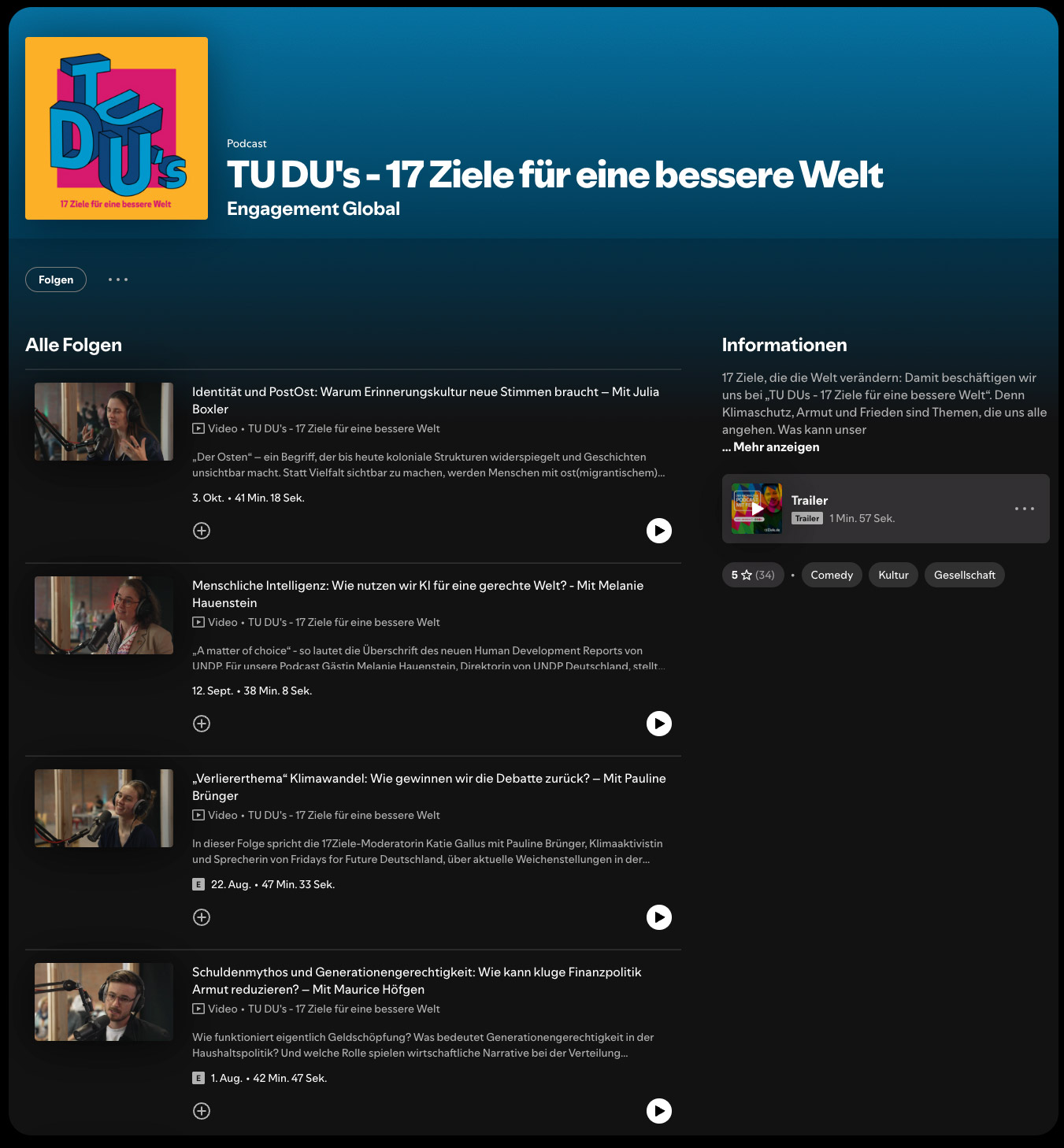 „Es gibt keine Grenzen, wie wir uns gegenseitig das Leben besser machen können. Es gibt immer Sachen, die es zu tun gibt.“ – Maurice Höfgen bringt es auf den Punkt. Und genau darum geht es auch im Podcast „TU DU’s – 17 Ziele für eine bessere Welt“.