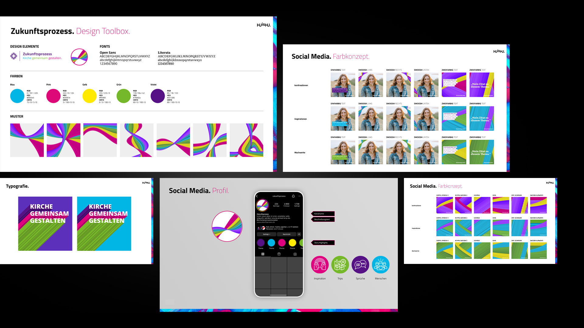 Für die Gestaltung von Druck- und Digitalmedien wünschte sich das Zukunftsprozess-Team eine umfassende Toolbox aus optischen Elementen und Design-Vorlagen, die Menschen berühren und zur Beteiligung an diesem Prozess bewegen.